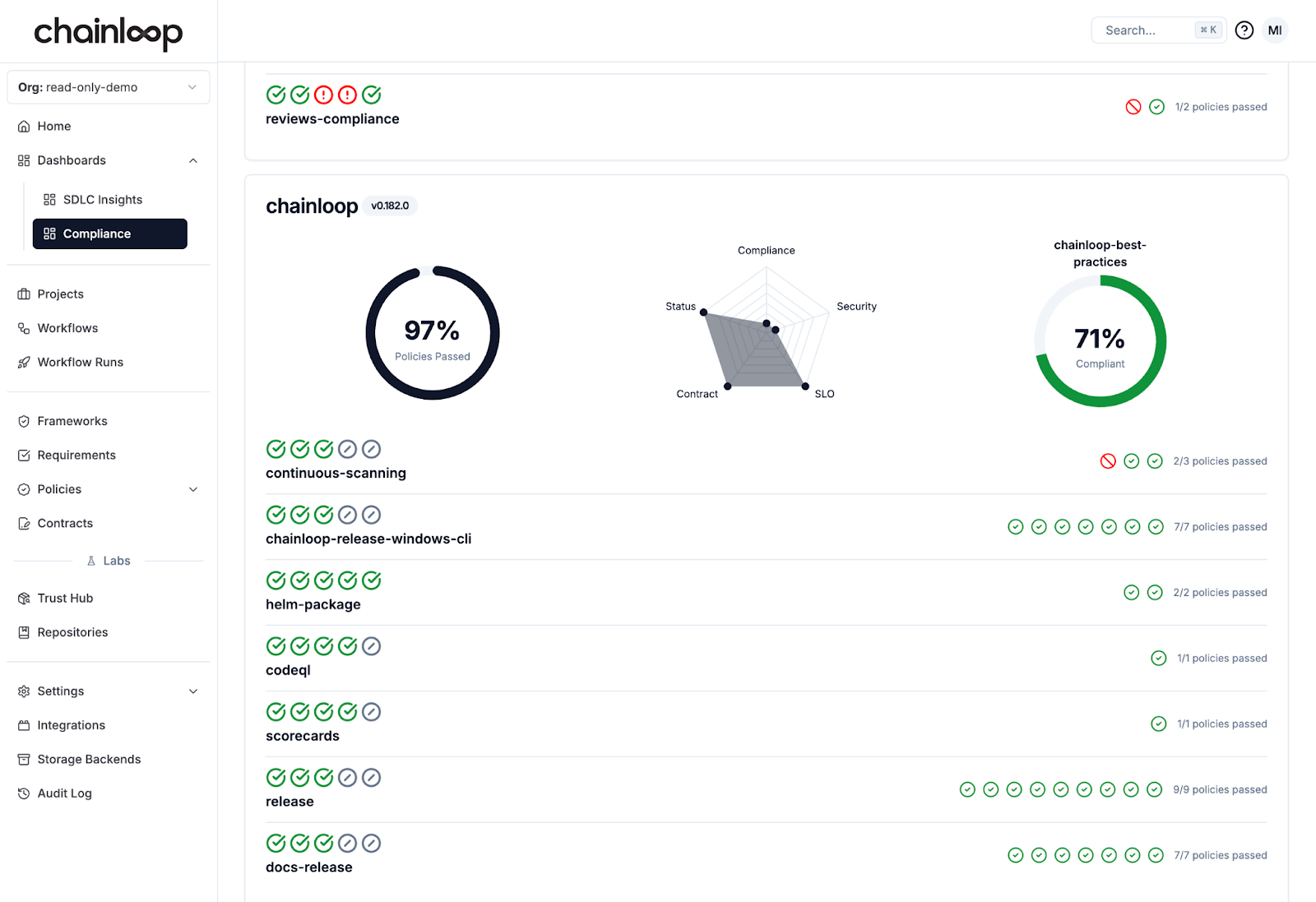 These properties make platform teams love Chainloop; they can focus on instrumenting, collecting, and writing policies, all of which are declaratively implemented as code.